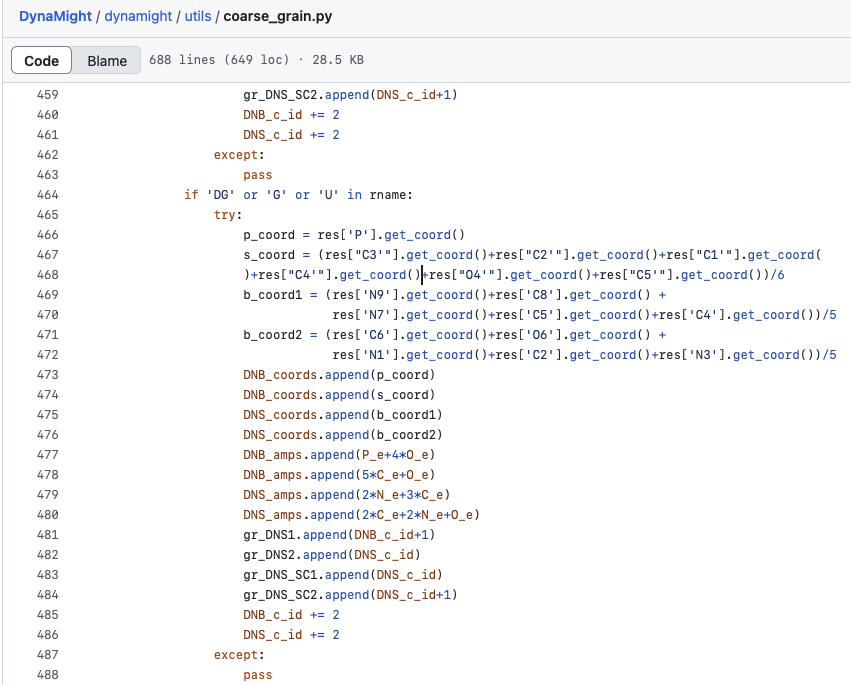 This model was not easy for me to work with which allowed me to dig deep into the underlying code for debugging. (Not to criticize the model or the code- I have never been able develop such an algorithm from scratch, what an accomplishment!). One of the most suprising finds during the debugging process came from realizing that the coarse graining script kept omitting uracils. Fortunately, at the time I was taking Carolyn Bertozzi’s Therapeutic Chemistry course. In the course she encouraged all graduate students to regularly memorize the structure of each nucleic acid. I listened and made an effort last spring to regularly draw each of the nucelobases. From this I could easily catch an error in DynaMight’s coarse graining code: guanine and uracil were given the same atomic labels, even though uracil is a completely different structure, lacking the purine-specific atoms used to coarse grain guanine.