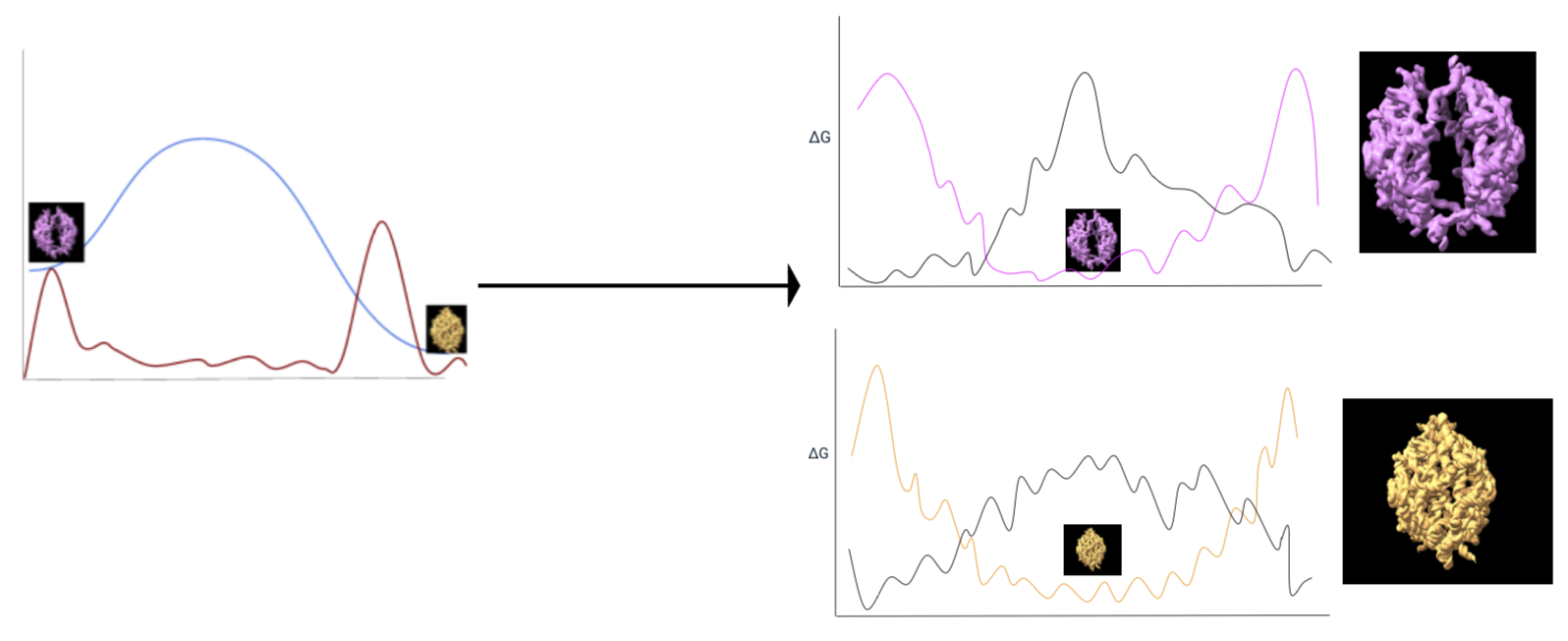 Probing the conformational landscapes of ROOL particles from open and closed classes separately with heterogeneity algorithms. Figure on the left represents a simplified energy landscape of ROOL (blue) superimposed with an estimated relative population of states (red) to illustrate the hypothesis that open and closed conformations represent favorable thermodynamic states separated by a kinetic barrier. Figures on the right represent individual simplified energetic landscapes of the open (top, pink) and closed (bottom, yellow) states with black lines representing an estimated relative population of particles in corresponding states. Our analysis changed from trying to recover states within the poorly populated red region between both open and closed states (left), to the rare populated peripheral regions of either primary structure (right).