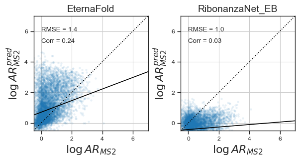 Because many if not most riboswitches in the EternaBench dataset did not have significant differences in MS2 binding affinity with and without ligand bound, to test whether the model can predict RNA structure with ligand bound I also fine-tuned RibonanzaNet on the activation ratio, and evaluated results :